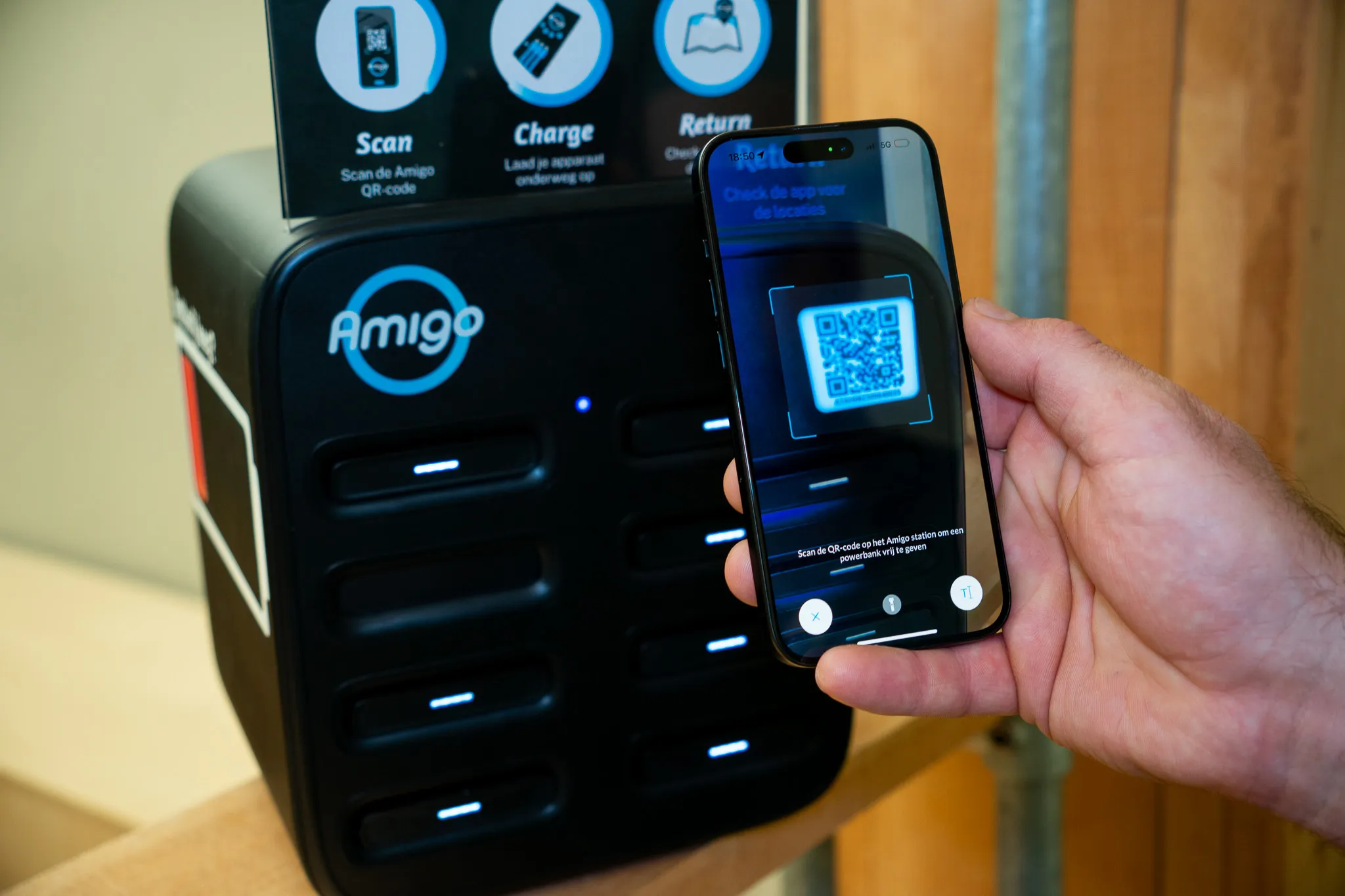 Huur binnen een paar seconden een powerbank, laad je telefoon op waar je ook bent en breng ‘m terug bij elk Amigo-station.